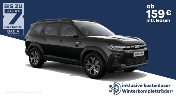 Dacia Bigster Essential mild hybrid-G 140: Fahrzeugpreis inkl. Dacia Full Service Vertrag⁸ im Wert von 1.390 €: 25.380 €. Leasingsonderzahlung: 2.030 €. Laufzeit: 36 Monate. Gesamtlaufleistung: 30.000 km. Gebundener Sollzins: 0,00 %. Monatsrate: 159 € inkl. darin enthaltener monatlicher Versicherungsprämie Restratenversicherung⁹ i. H. v. 9,02 € sowie GAP-Versicherung¹⁰ i. H. v. 26,21 €. Gesamtbetrag: 7.754 €.