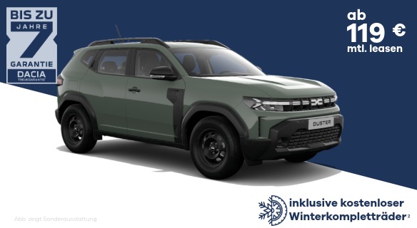 1 Gültig für Kaufanträge vom 10.11. bis 31.12.2025 und Zulassung bis 31.12.2025 für alle Dacia Modelle bei Leasing über Mobilize Financial Services, Geschäftsbereich der RCI Banque S.A. Niederlassung Deutschland, Jagenbergstr. 1, 41468 Neuss, zzgl. Überführungskosten. Ausgenommen Dacia Spring, Neuer Sandero, Neuer Sandero Stepway und Neuer Jogger. Bei allen teilnehmenden Dacia Partnern.