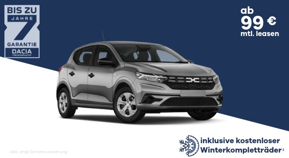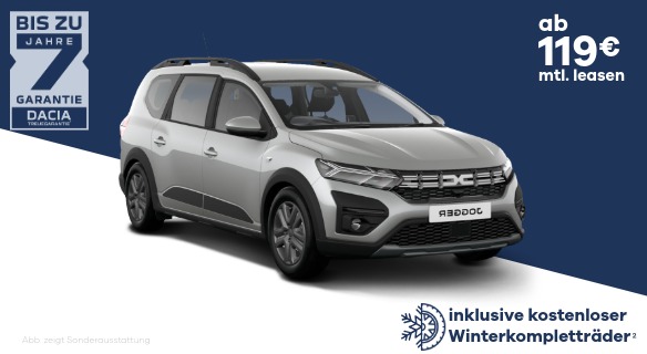 2 Gültig für Kaufanträge vom 16.10. bis 30.11.2025 und Zulassung bis 22.12.2025 für vier Winterkompletträder bei Leasing oder Finanzierung über Mobilize Financial Services, Geschäftsbereich der RCI Banque S.A. Niederlassung Deutschland, Jagenbergstr. 1, 41468 Neuss, zzgl. Überführungskosten. Ausgenommen Dacia Spring. Gültig für Bestandsfahrzeuge. Reifenformat und Felgendesign nach Verfügbarkeit. Bei allen teilnehmenden Dacia Partnern.