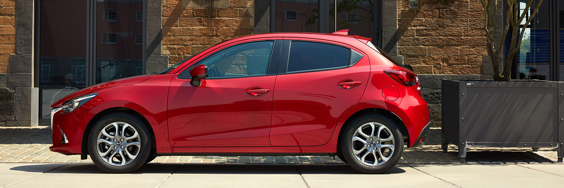 Die kraftvolle Haltung, muskulöse Linien, die nach hinten versetzte Kabine und eine insgesamt nach vorne strebende Optik laden den kleinsten Mazda mit einer Ausstrahlung und Emotion auf, die in dieser Fahrzeugklasse nur selten anzutreffen sind – und die das typische Kleinwagendesign gewissermaßen