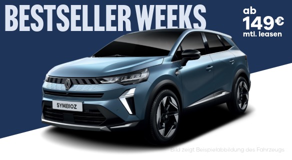 4 Renault Symbioz Evolution Mild Hybrid 140: Fahrzeugpreis: 25.168 €. Leasingsonderzahlung: 3.920 €. Laufzeit: 36 Monate. Gesamtlaufleistung: 30.000 km. Monatsrate: 149 €. Gesamtbetrag: 9.277 €. Nur gültig für sofort verfügbare Renault Fahrzeuge: Clio, Captur, Austral und Symbioz. Ein Kilometerleasing-Angebot von Mobilize Financial Services, Geschäftsbereich der RCI Banque S.A. Niederlassung Deutschland, Jagenbergstr. 1, 41468 Neuss, zzgl. Überführungskosten. Gültig für Privatkund/-innen vom 07.11. bis 30.11.2025 mit Zulassung bis zum 31.12.2025. Bei allen teilnehmenden Renault Partnern.