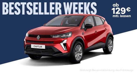 2 Renault Captur Evolution TCe 115: Fahrzeugpreis: 21.570 €. Leasingsonderzahlung: 3.400 €. Laufzeit: 36 Monate. Gesamtlaufleistung: 30.000 km. Monatsrate: 129 €. Gesamtbetrag: 8.042 €. Nur gültig für sofort verfügbare Renault Fahrzeuge: Clio, Captur, Austral und Symbioz. Ein Kilometerleasing-Angebot von Mobilize Financial Services, Geschäftsbereich der RCI Banque S.A. Niederlassung Deutschland, Jagenbergstr. 1, 41468 Neuss, zzgl. Überführungskosten. Gültig für Privatkund/-innen vom 01.10. bis 30.11.2025 mit Zulassung bis zum 31.12.2025. Bei allen teilnehmenden Renault Partnern.